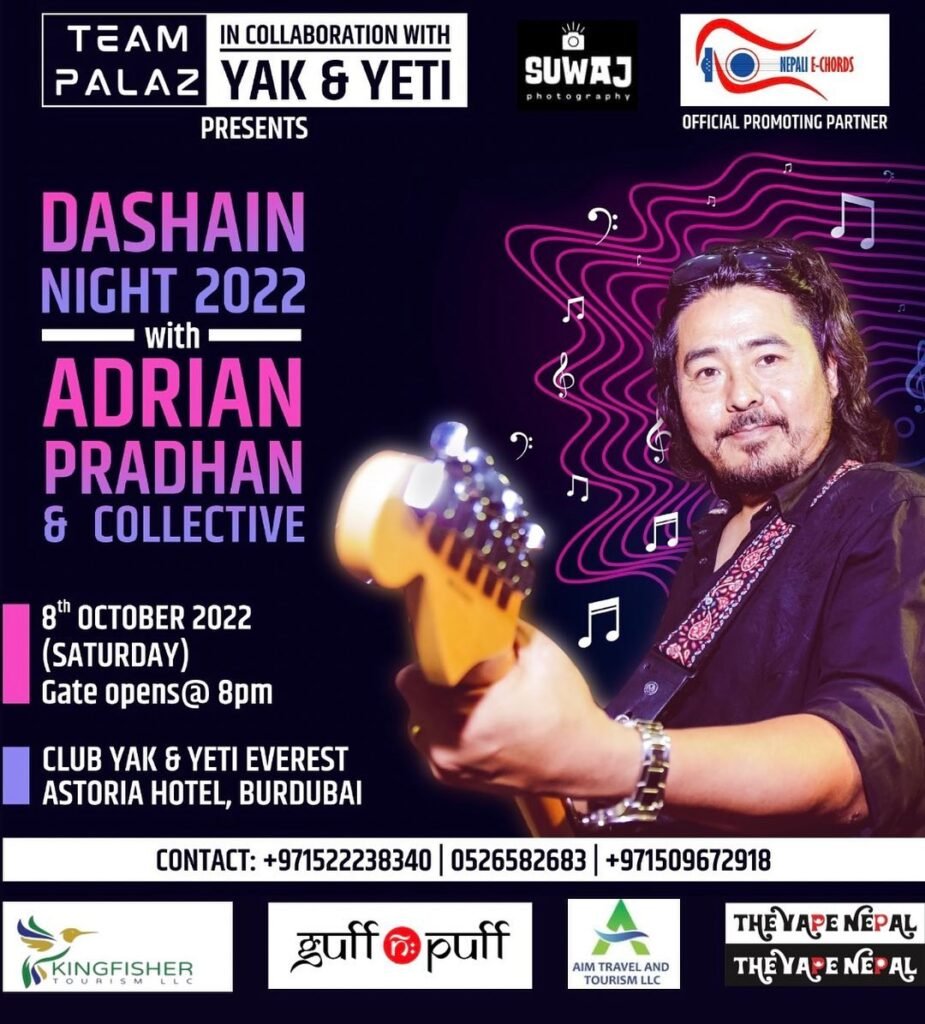 Celebrate This Dasain !! with Adrian Pradhan Collective Date : 8th October Venue : Club Yak N Yeti Everest, Burdubai